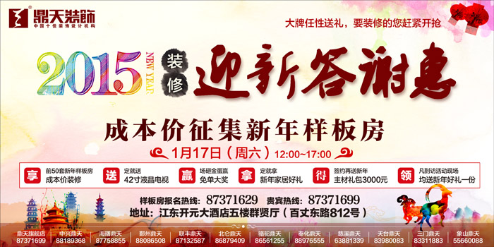 新年裝修,大牌家裝公司會有怎樣的“任性”表現(xiàn)?鼎天裝飾2015裝修迎新答謝惠,大牌任性送禮,要裝修的您趕緊開搶! 大牌“任性”饋禮多 1月17日(周六),鼎天裝飾在寧波江東開元大酒店五樓群賢廳舉辦“2015裝修迎新答謝惠”,現(xiàn)場任性送禮。迎新答謝,鼎天裝飾向全甬城待裝修客戶發(fā)出50套新年樣板房征集令,以成本價為其裝修;活動中,客戶下定金,除了抱42寸LED液晶電視回家,還可拎走一份新年家居好禮;同時現(xiàn)場還可砸金蛋贏各種免單大獎。 “任性”就此結(jié)束?還沒呢,下單客戶還能再享3000元新年主材禮包,這3000元可以購買,瓷磚、地板、櫥柜、窗簾等。所有來到迎新答謝惠的客戶,都可以拿到一份精心準備的新年禮物哦! 迎新家裝送品質(zhì) 這場裝修迎新答謝惠,鼎天裝飾不光送上大禮,還要送上品質(zhì),送上貼心服務。 活動中,鼎天裝飾攜“至尊工作室”豪華設計師陣容亮相,并推出“在裝工地體驗”活動。開通百套實景樣板房直通車,讓業(yè)主們現(xiàn)場體驗不同風格、不同戶型、不同施工階段的裝修,聆聽設計師的設計講解,感受真實空間的設計元素布局。這樣的實力,絕對保障您的家裝在設計、工程上的品質(zhì)。 現(xiàn)場,業(yè)主們還可品鑒鼎天裝飾在諸多知名小區(qū)中打造的數(shù)千套優(yōu)秀案例,如青林灣、維科上院、鈺鼎園、蘇園、印象外灘、星河國際、君瀾上府、榮安心居、中海凱旋門、鉑翠灣、東海府、集成廣場、紫玉花園、君雅苑、金色瓏庭、東都華庭、光大江灣府第、金橋水岸、公元世家、南熙園、宜家花園、晴園、麗景英郡、保利城、永和居易、芳辰麗陽、華城花園、蝶園、IN藍庭、雷迪森廣場、英倫水岸、東湖觀邸、皇冠花園、盛世天城、江南一品、雍城世家、水岸楓情、BOBO城、風格城事、上上城等。大牌就是這么有底氣! 同時,還有鼎天美艷5號、美艷8號精裝套餐作品,也將聯(lián)袂為您送上新春祝?!铝轲菢I(yè)主打造省錢、省心、省力裝修! 特別預告: 1月17日(周六)12:00---17:00,鼎天裝飾在寧波江東開元大酒店(百丈東路812號)五樓群賢廳舉辦“2015裝修迎新答謝惠”,現(xiàn)場限量征集前50套“新年特惠”樣板房,以成本價為其裝修,且由鼎天至尊工作室、金牌施工團隊聯(lián)手打造完美家裝樣板工程。 樣板房報名熱線:87371629 貴賓熱線:87371699