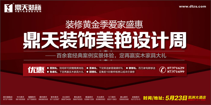 五月之美,始于綠意濃稠;五月裝修之美,始于美艷設(shè)計(jì)周,這黃金季的盛惠。在這綠色的時(shí)節(jié),鼎天裝飾設(shè)計(jì)師們已是迸發(fā)出最強(qiáng)烈的設(shè)計(jì)靈感,妝扮生活,為您打造愛家。5月23日,鼎天美艷設(shè)計(jì)周奉獻(xiàn)最豐盛的設(shè)計(jì)盛宴,最吸引人的優(yōu)惠大獎(jiǎng),問候五月,致敬綠色。地點(diǎn):凱洲大酒店四樓嘉洲廳(天一廣場(chǎng)南面)。 設(shè)計(jì):致敬專屬的生活 多年來(lái),對(duì)裝修設(shè)計(jì)時(shí)尚元素的不斷整理、分析和提取,鼎天裝飾積累了深厚的設(shè)計(jì)創(chuàng)意功底。針對(duì)不同人群,鼎天裝飾設(shè)計(jì)了在商業(yè)快節(jié)奏里突顯溫情的慢調(diào),專為都市白領(lǐng)打造的優(yōu)雅,滿足城市精英的個(gè)性和專屬別墅的華貴舒適等。在千余套不同小區(qū)、不同風(fēng)格的室內(nèi)設(shè)計(jì)臻品案例中,5月23日美艷設(shè)計(jì)周為您一一呈現(xiàn)。 針對(duì)高端別墅裝修的業(yè)主,鼎天裝飾通過自身強(qiáng)大的資源整合能力,以及領(lǐng)攜至尊工作室設(shè)計(jì)團(tuán)隊(duì)推行別墅裝飾的整體規(guī)劃設(shè)計(jì)與施工、別墅設(shè)備、主材、家具、配飾的私屬定制一站式服務(wù),在細(xì)節(jié)上做到極致,滿足高端消費(fèi)者在居家裝修上的各種需求。如設(shè)計(jì)階段布局智能家居系統(tǒng),實(shí)現(xiàn)智能安防、新風(fēng)、吸塵、凈水、溫控、娛樂等居家功能等,為您打造一站式健康舒適的專屬生活。 優(yōu)惠:整套實(shí)木餐桌等您贏取 美艷設(shè)計(jì)周,5重好禮樂享不盡:簽到禮、簽單禮、連購(gòu)禮、免單禮及回饋禮輪翻上演。只要到訪活動(dòng),所有業(yè)主都可拿一份精美禮品;下定即送家居健康好禮,并憑鼎天裝飾定單,參與砸金蛋得免單大獎(jiǎng),除了建材、家電、工程抵用款等心動(dòng)大獎(jiǎng),更有整套美式實(shí)木餐桌等您現(xiàn)場(chǎng)贏取,單單有獎(jiǎng),等您敲定。此外,活動(dòng)還推出品牌建材聯(lián)盟大特惠,不僅有特價(jià)爆款,還享受連購(gòu)禮,(根據(jù)連購(gòu)的建材品類數(shù)量)免費(fèi)收獲電飯煲、洗衣機(jī)等實(shí)用家電大禮。五月裝修強(qiáng)惠來(lái)襲,就在這一天了! 到訪業(yè)主還可參與“在裝工地體驗(yàn)行”?;顒?dòng)開通了百套實(shí)景樣板房直通車,讓業(yè)主們現(xiàn)場(chǎng)體驗(yàn)不同風(fēng)格、不同戶型、不同施工階段的裝修在建工地,聆聽設(shè)計(jì)師的設(shè)計(jì)講解,感受真實(shí)空間的設(shè)計(jì)元素布局。如:青林灣、海外灘、新外灘一號(hào)、銘豪觀樾、維科上院、鈺鼎園、蘇園、印象外灘、星河國(guó)際、舒沁苑、君和院、世貿(mào)首府、銀億東岸、風(fēng)格尚品、盛世華府、金億文園、悅瀾灣、景瑞望府、君瀾上府、榮安心居、鉑翠灣、東海府、藏瓏、締壹城、君園和莊、山清軒、銀億上郡、文瀾水岸、左岸尚苑、金色江山、水榭花都、中海國(guó)際社區(qū)、紫玉花園、麗江苑、君雅苑、金色瓏庭、東都華庭、宜家花園、晴園、麗景英郡、保利城、芳辰麗陽(yáng)、英倫水岸、東湖觀邸、盛世天城、江南一品、雍城世家、上上城等甬城小區(qū)由您選擇。如此細(xì)致,只為保障您的家裝在設(shè)計(jì)、工程上的品質(zhì)。 專業(yè):整體家居方案 大眾之選 “好生活,好設(shè)計(jì)”,鼎天裝飾的裝修設(shè)計(jì)理念同樣致力于為大眾消費(fèi)者打造精品之家,并以整體家居解決方案,滿足大眾裝修省心、省力、省錢的需求。目前,鼎天裝飾成功推出的美艷1號(hào)、美艷5號(hào)、美艷8號(hào)及美艷999等精裝套餐,已在市場(chǎng)上取得了巨大成功,深受都市白領(lǐng)、經(jīng)典婚房及改善型裝修者的青睞。每套方案,鼎天裝飾都結(jié)合了全體設(shè)計(jì)師團(tuán)隊(duì)的設(shè)計(jì)智慧,在裝修風(fēng)格、價(jià)格、適宜人群等全面細(xì)化,并制定教課書般施工方案,由金牌施工團(tuán)隊(duì)全力打造。因?yàn)閷?shí)行有效地資源整合,據(jù)估算,精裝套餐整體家居還比常規(guī)裝修節(jié)省費(fèi)用400-500元/平方米。 五月之美,開啟美艷設(shè)計(jì)周! 特別預(yù)告: 5月23日(周六)9:00---17:00,鼎天裝飾在凱洲大酒店四樓嘉洲廳(天一廣場(chǎng)南面)舉辦“美艷設(shè)計(jì)周”裝修黃金季愛家盛惠活動(dòng),現(xiàn)場(chǎng)限量征集前100套鼎天“美艷”樣板房,并以成本價(jià)為其裝修,且由鼎天至尊工作室、金牌施工團(tuán)隊(duì)聯(lián)手打造完美家裝樣板工程?,F(xiàn)場(chǎng)還尊享一站式家裝建材購(gòu)齊服務(wù),優(yōu)惠史無(wú)前例! 樣板房報(bào)名熱線:87371629 貴賓熱線:87371699