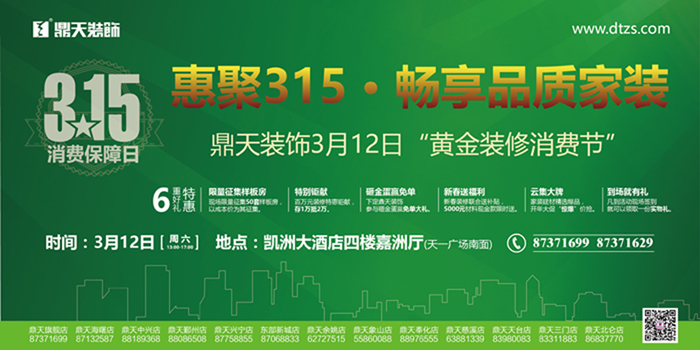 惠聚3·15,獻上6重豪禮 3月12日(周六),鼎天裝飾響應(yīng)3·15消費者權(quán)益日,將在凱洲大酒店四樓嘉洲廳舉辦“黃金裝修消費節(jié)”,鉅惠6重豪禮,筑造品質(zhì)家裝。 活動限量征集前50套樣板房,成本價裝修,金牌施工團隊打造。當日下定,最高可享存1萬抵2萬特惠,及砸金蛋贏免單大禮。還有家裝公司、建材商聯(lián)合送補貼,5000元材料款限時領(lǐng)取。一線建材品牌精選爆品現(xiàn)場開搶。最后,簽到都有禮。 我裝修,我做主 “新消費 我做主”,這是今年消費者權(quán)益日的主題。裝修消費也許稱不上新,但實在是一項成本、時間高昂的消費,同時又極具個性化和追求自我,所以細想來,這個主題與裝修竟也十分貼切。裝修,就得我做主。 本次活動,鼎天裝飾就秉承“誠實守信,客戶為先”原則,一切都由您做主。首先任性挑選設(shè)計師,鼎天至尊工作室設(shè)計師團隊現(xiàn)場坐鎮(zhèn),由您選擇中意的設(shè)計師一對一服務(wù)。 其次,現(xiàn)場安排有“在裝工地體驗行”,百套實景樣板房由您決定看哪套,免費安排車輛接送。再有數(shù)千套優(yōu)秀裝修案例,包含青林灣、寰宇天下、東海府、濱江府、景瑞上府、羅蒙環(huán)球城、鉑翠灣、東方一品、天境花園、海外灘、新外灘一號、中海國際社區(qū)、銘豪觀樾、維科上院、鈺鼎園、蘇園、印象外灘、星河國際、舒沁苑、樂筑良品、君和院、銀億東岸、風(fēng)格尚品、盛世華府、金億文園、悅瀾灣、景瑞望府、君瀾上府、榮安心居、藏瓏、締壹城、君園和莊、山清軒、銀億上郡、文瀾水岸、左岸尚苑、金色江山、水榭花都、紫玉花園、麗江苑、君雅苑、金色瓏庭、東都華庭、宜家花園、晴園、麗景英郡、保利城、芳辰麗陽、英倫水岸、東湖觀邸、盛世天城、江南一品、雍城世家、上上城等諸多知名小區(qū),任您參考借鑒。 誠信如金,品質(zhì)如鐵。裝修無小事,天天是3·15。鼎天裝飾扎根寧波裝修行業(yè)17年,從中積聚了深厚的客戶口碑,就是一直保持著這樣的理念。本次活動,我們初心不變。