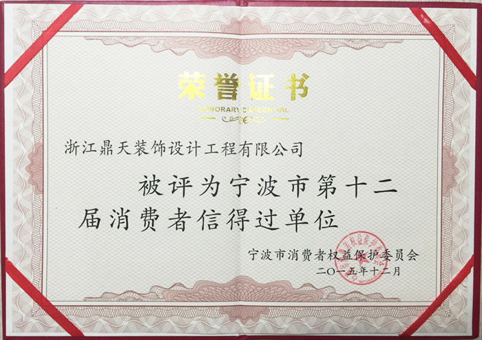 為推進(jìn)我市社會信用體系建設(shè),增強廣大經(jīng)營者誠實守信意識,塑造一批商貿(mào)、服務(wù)業(yè)的文明典范,切實保護(hù)消費者的合法權(quán)益,我市消保委于2015年8月起開展了第十二屆“寧波市消費者信得過單位”評選活動。通過各個組織的審核考評,最終鼎天裝飾獲得“寧波市第十二屆消費者信得過單位”。