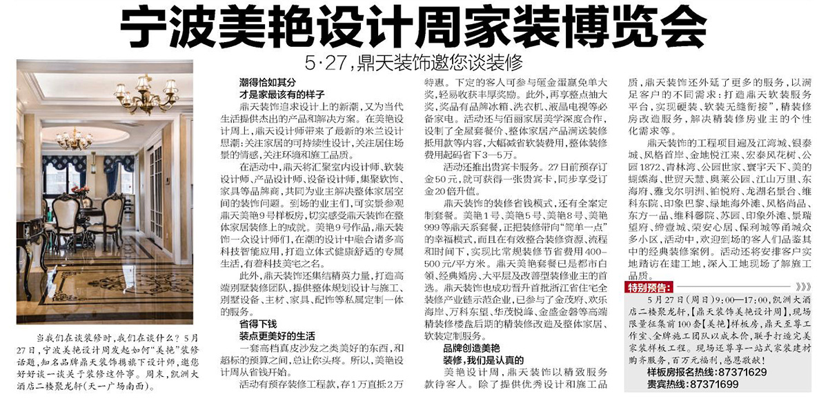 寧波美艷設(shè)計(jì)周,為當(dāng)下生活提供杰出的家居產(chǎn)品和裝飾解決方案。本周末,鼎天裝飾匯聚室內(nèi)設(shè)計(jì)師、軟裝設(shè)計(jì)師、產(chǎn)品設(shè)計(jì)師等大咖,從空間規(guī)劃,到軟飾搭配,到家具定制,為業(yè)主全方位設(shè)計(jì)當(dāng)潮時(shí)尚生活空間。 一切美好,從省錢(qián)開(kāi)始 在美艷設(shè)計(jì)周,省下錢(qián),成就時(shí)尚裝修?;顒?dòng)前(27日前),到鼎天預(yù)存50元訂金,就可收獲貴賓卡一張,享受訂金20倍升值?;顒?dòng)當(dāng)天,預(yù)存裝修工程款,存1萬(wàn)抵2萬(wàn); 下定還享有砸金蛋贏免單大獎(jiǎng)和整點(diǎn)抽大獎(jiǎng)機(jī)會(huì),有品牌冰箱、洗衣機(jī)、液晶電視等豐厚獎(jiǎng)品恭候。活動(dòng)還與佰麗家居美學(xué)深度合作,推出全屋家具套餐價(jià)、整體家居產(chǎn)品滿(mǎn)送裝修抵用款等內(nèi)容,整體裝修費(fèi)用起碼省下3—5萬(wàn)。 鼎天裝飾的裝修省錢(qián)模式,還有全案定制套餐。美艷1號(hào)、美艷5號(hào)、美艷8號(hào)、美艷999等鼎天系套餐,正把裝修帶向“簡(jiǎn)單一點(diǎn)”的幸福模式,而且在有效整合裝修資源、流程和時(shí)間下,實(shí)現(xiàn)比常規(guī)裝修節(jié)省費(fèi)用400-500元/平方米。鼎天美艷套餐已是都市白領(lǐng)、經(jīng)典婚房、大平層及改善型裝修業(yè)主的首選。鼎天裝飾也成功晉升首批浙江省住宅全裝修產(chǎn)業(yè)鏈?zhǔn)痉镀髽I(yè),已參與了金茂府、歡樂(lè)海岸、萬(wàn)科東望、華茂悅峰、金盛金磐等高端精裝修樓盤(pán)后期的精裝修改造及整體家居、軟裝定制服務(wù)。 精致服務(wù),從整裝開(kāi)始 美艷設(shè)計(jì)周,鼎天裝飾以精致服務(wù)款待客人。除了提供優(yōu)秀設(shè)計(jì)和施工品質(zhì),鼎天裝飾還外延了更多的功能服務(wù),以滿(mǎn)足客戶(hù)的不同需求:打造整體家居服務(wù)平臺(tái),實(shí)現(xiàn)硬軟裝的無(wú)縫銜接;提供整體家具、軟裝定制等服務(wù),給予客戶(hù)更貼身和審美的產(chǎn)品;推出精裝修房改造服務(wù),解決精裝修房業(yè)主的個(gè)性化需求等等。 在美艷設(shè)計(jì)周,鼎天裝飾還為客戶(hù)整理江灣城、銀泰城、風(fēng)格首岸、金地悅江來(lái)、宏泰風(fēng)花樹(shù)、公園1872、青林灣、公園世家、寰宇天下、美的蝴蝶海、奧萊公園、江山萬(wàn)里、雅戈?duì)柮髦蕖⒕S科東院、印象巴黎、綠地海外灘、風(fēng)格尚品、東方一品、維科馨院、蘇園、印象外灘、景瑞望府、締壹城、榮安心居、保利城等甬城眾多小區(qū)的經(jīng)典裝修案例,以供鑒賞;并安排客戶(hù)實(shí)地踏訪在建工地,深入工地現(xiàn)場(chǎng)了解施工品質(zhì)。 5月27日,美艷裝修,從設(shè)計(jì)出發(fā),從服務(wù)深化。 特別預(yù)告: 5月27日(周日)9:00---17:00,凱洲大酒店二樓聚龍軒,【鼎天裝飾美艷設(shè)計(jì)周】,現(xiàn)場(chǎng)限量征集前100套【美艷】樣板房,鼎天至尊工作室、金牌施工團(tuán)隊(duì)以成本價(jià),聯(lián)手打造完美家裝樣板工程。現(xiàn)場(chǎng)還尊享一站式家裝建材購(gòu)齊服務(wù),百萬(wàn)元福利,感恩敬獻(xiàn)! 樣板房報(bào)名熱線:87371629 貴賓熱線:87371699 摘自2018年5月25日 寧波晚報(bào) |