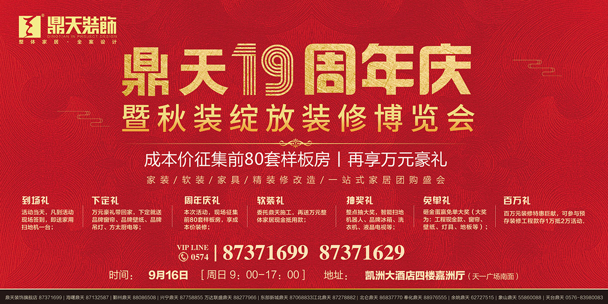9月,鼎天裝飾的19周年。這場周年慶,我們不打算低調(diào)。9月16日,秋“裝”綻放,鼎天裝飾獨屬的19周年慶裝修博覽會,在凱洲大酒店四樓嘉洲廳,為您帶來獨屬的裝修盛惠。19年的深度服務(wù),時間驗證下的品牌實力,這個周末,釋放對生活空間的全部想像,讓鼎天裝飾為您設(shè)計、為您打造愛家。 19周年禮,像秋天的豐收 周年慶,我們準備了不少禮物:超低價換購樣板房家具;送萬元整體家居、軟裝現(xiàn)金抵用款;現(xiàn)場下定,送窗簾、送墻紙、送吊燈、送方太廚電等。豐盛的各色禮物,希望您有一個甜美的秋季和裝修體驗。 此外,參加本次活動,可預(yù)存裝修工程款,存1萬抵2萬。現(xiàn)場下定,整點抽大獎:循環(huán)抽智能掃地機器人、品牌冰箱、洗衣機、液晶電視等;還能砸金蛋贏免單大獎,即享工程現(xiàn)金款、燈具、地板等。百萬元周年慶裝修特惠,秋季獨享,耀眼9月。 19年,用心一如既往 在19年里,我們見證了:裝修客戶們從對裝修的懵懂,到開始在裝修中,融入自己的思考和對生活的態(tài)度;而我們則從引導的角色,轉(zhuǎn)變?yōu)闈M足客戶需求,實現(xiàn)客戶構(gòu)想的輔助師。這么多年,鼎天用更好的材料,更優(yōu)秀的工藝,更潮流的設(shè)計,用實在品質(zhì)不斷贏取客戶的認同。今年,鼎天裝飾榮獲了“寧波市第七屆十大家裝品牌企業(yè)”。 此次活動,鼎天裝飾集聚雄厚的設(shè)計師和施工團隊,為您深度服務(wù)。業(yè)主們還能現(xiàn)場品鑒江灣城、銀泰城、蓮橋府、金茂悅、緹香郡、尚雅府、雅旭花苑、風格首岸、保利印江南、中梁壹號院、奧體未來城、金地悅江來、宏泰風花樹、公園1872、公園世家、奧萊公園、江山萬里、雅戈爾明洲、風格尚品、維科馨院、碧玥府、印象湖濱,紅星國際廣場、紅星豐璟苑、締壹城三期等眾多小區(qū)的裝修實例;同時,實地參觀在建工地,深入工地現(xiàn)場了解施工品質(zhì)。 針對客戶對個性裝修的審美需求,鼎天裝飾的高端別墅裝修團隊,特別提供集整體規(guī)劃設(shè)計與施工、別墅設(shè)備、主材、家具、配飾等私屬定制于一體的服務(wù)。 整體家居服務(wù),一站式享受 追求個性,也需求便利,這是現(xiàn)在業(yè)主對裝修的主流想法。鼎天裝飾從開發(fā)第一款美艷1號產(chǎn)品,到推出美艷5號、美艷8號、美艷999,及“科技美宅”美艷9號等系列套餐,從整裝服務(wù),集時尚個性和省心省力,不斷滿足客戶需求。 現(xiàn)在,鼎天美艷套餐已成為都市白領(lǐng)、經(jīng)典婚房、大平層及改善型裝修業(yè)主的首選,在有效整合裝修資源、流程和時間下,更是比常規(guī)裝修節(jié)省費用400-500元/平方米。裝修變得簡單卻不失精致。 鼎天裝飾深化自己的整體家居服務(wù),已實現(xiàn)硬軟裝的無縫銜接。旗下的軟裝體驗館,提供整體家具、軟裝定制等服務(wù)。給予客戶更貼合及審美的產(chǎn)品。鼎天裝飾也晉升為首批浙江省住宅全裝修產(chǎn)業(yè)鏈示范企業(yè),已參與了金茂府、歡樂海岸、萬科東望、玖著里、廣源里、桂語里、東晟府、榮安香園等高端精裝修樓盤后期的精裝修改造及整體家居、軟裝定制服務(wù)。 而隨著精裝修房的普及,鼎天裝飾又及時推出精裝修房微改造服務(wù),為精裝修房業(yè)主提供住宅空間的微調(diào)、微改,更細心地滿足客戶對家的小改動需求。 特別預(yù)告: 9月16日(周日)9:00-17:00,鼎天裝飾在凱洲大酒店四樓嘉洲廳(天一廣場南面)舉辦“19周年慶暨秋裝綻放裝修博覽會”,現(xiàn)場限量征集前80套成本價樣板房,且悅享百萬裝修特惠,并由鼎天至尊工作室、金牌施工團隊聯(lián)手打造完美家裝樣板工程?,F(xiàn)場還尊享一站式家裝建材購齊服務(wù)。種種福利,攻略9月裝修! 樣板房報名熱線:87371629 貴賓熱線:87371699
