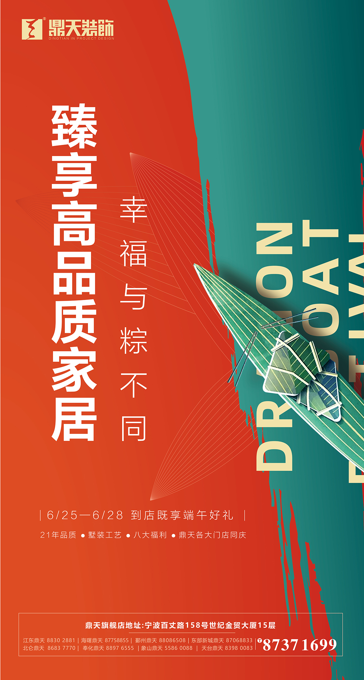 特別預(yù)告: 6月25日—28日,鼎天裝飾【端午特別活動】在鼎天各大門店舉辦,活動期間到店既享端午好禮。21年品質(zhì)●墅裝工藝●八大福利,鼎天至尊工作室、金牌施工團隊聯(lián)手打造五星級樣板工程。 鼎天旗艦店地址:百丈路158號世紀(jì)金貿(mào)大廈15層 報名熱線:87371629 貴賓熱線:87371699 |