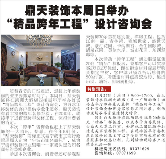 特別預(yù)告: 11月27日(周日)9:00---17:00,鼎天裝飾將在凱洲大酒店(天一廣場南面)四樓嘉年廳舉辦鼎天裝飾 “精品跨年工程”設(shè)計咨詢會和優(yōu)秀家裝作品圖片展,到活動現(xiàn)場盡享家裝建材大特價。同時鼎天還將在現(xiàn)場限量征集20套鼎天“精品”樣板房,以成本價為其裝修,由鼎天至尊工作室、金牌施工團(tuán)隊(duì)聯(lián)手打造完美家裝樣板工程。在現(xiàn)場簽單并委托鼎天裝修的業(yè)主可以享受到前所未有的優(yōu)質(zhì)服務(wù)和優(yōu)惠讓利。凡到活動現(xiàn)場客戶送精美禮品一份 樣板房報名熱線:87371629 咨詢熱線:87371699