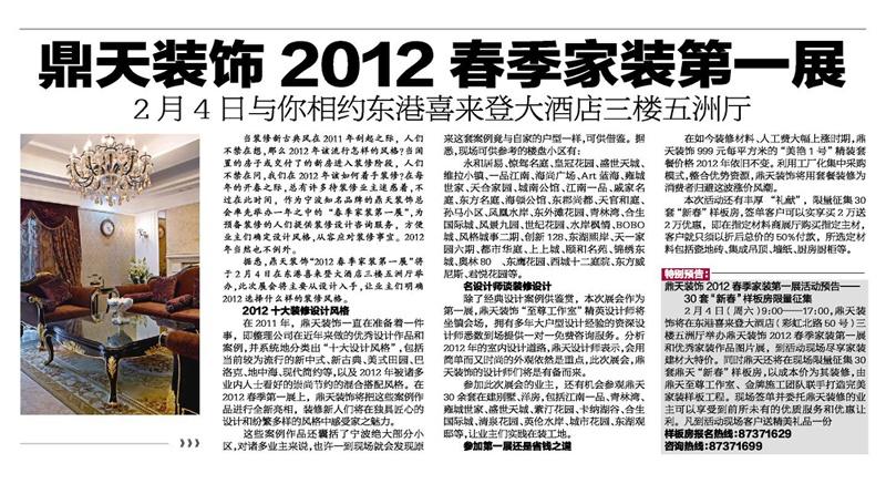 特別預告: 鼎天裝飾2012春季家裝第一展活動預告—— 30套“新春”樣板房限量征集 2月4日(周六)9:00---17:00,鼎天裝飾將在東港喜來登大酒店(彩虹北路50號)三樓五洲廳舉辦鼎天裝飾2012春季家裝第一展和優(yōu)秀家裝作品圖片展,到活動現(xiàn)場盡享家裝建材大特價。同時鼎天還將在現(xiàn)場限量征集30套鼎天“新春”樣板房,以成本價為其裝修,由鼎天至尊工作室、金牌施工團隊聯(lián)手打造完美家裝樣板工程?,F(xiàn)場簽單并委托鼎天裝修的業(yè)主可以享受到前所未有的優(yōu)質(zhì)服務和優(yōu)惠讓利。凡到活動現(xiàn)場客戶送精美禮品一份 樣板房報名熱線:87371629 咨詢熱線:87371699