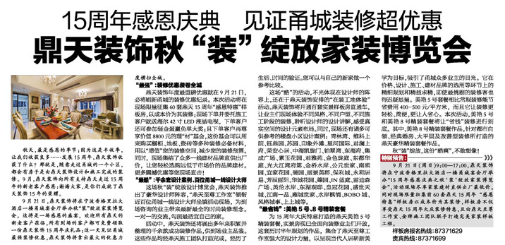 刷新甬城裝修優(yōu)惠紀錄 9月21日,鼎天裝飾將在寧波香格里拉大酒店一樓甬城宴會廳舉辦秋“裝”綻放家裝博覽會。這是一場感恩的盛宴,感謝所有支持鼎天走過15年的新老客戶,屆時歡迎所有鼎天的新老客戶蒞臨,所有到場的客戶都可免費領(lǐng)取一份鼎天裝飾15周年慶禮品。 這一天甬城裝修優(yōu)惠力度最大,鼎天裝飾將拿出最強的優(yōu)惠力度橫掃甬城?,F(xiàn)場下單并委托施工客戶就送海爾42寸LED液晶電視,下單客戶還可參加砸金蛋贏免單大獎;且下單客戶再尊享價值8800元的理“材”基金,這份基金可以用來購買包括櫥柜、地板、瓷磚等多種裝修必備材料,足以“增值”您的裝修空間,減少您的裝修預(yù)算。同時,現(xiàn)場集結(jié)了眾多一線建材品牌直供出廠價,讓您惠中加惠,輕松選購遠低于市場價的品牌建材。更多震撼優(yōu)惠等您現(xiàn)場直擊! 這場秋“裝”綻放設(shè)計博覽會,鼎天裝飾推出了豪華設(shè)計師陣容,“鼎天至尊工作室”領(lǐng)銜近百位甬城一線設(shè)計大師坐鎮(zhèn)活動現(xiàn)場,為到場咨詢的業(yè)主帶來最新最全的時尚裝修理念。一對一的交流,勾畫最適宜自己的家。 這場“酷”的活動,不光體現(xiàn)在設(shè)計師的陣容上,還在于鼎天裝飾安排的“在裝工地體驗”活動。鼎天裝飾將開通百套實景樣板房直通車,讓業(yè)主們現(xiàn)場體驗不同風(fēng)格、不同戶型、不同施工階段的裝修,聆聽設(shè)計師的設(shè)計講解,感受真實空間的設(shè)計元素布局,以及向項目經(jīng)理提問施工工藝。同時,現(xiàn)場還有諸多可供參考的樓盤小區(qū)設(shè)計案例:青林灣、維科上院、鈺鼎園、蘇園、印象外灘、星河國際、君瀾上府、榮安心居、中海凱旋門、鉑翠灣、東海府、集成廣場、紫玉花園、君雅苑、金色瓏庭、東都華庭、光大江灣府第、金橋水岸、公元世家、南熙園、宜家花園、晴園、麗景英郡、保利城、永和居易、芳辰麗陽、華城花園、蝶園、IN藍庭、雷迪森廣場、英倫水岸、東湖觀邸、皇冠花園、盛世天城、江南一品、雍城世家、水岸楓情、BOBO城、風(fēng)格城事、上上城等甬城眾多中高端小區(qū)。 當然,深受市場喜愛的鼎天裝飾美艷系列精裝套餐“美艷5號”和“美艷8號”也會在活動中為您介紹。美艷5號精裝實景房現(xiàn)已全面開放,屆時邀您踏訪參觀! 特別預(yù)告: 9月21日(周日)9:00---17:00,鼎天裝飾將在寧波香格里拉大酒店一樓甬城宴會廳舉辦“15周年感恩慶典之秋‘裝’綻放家裝博覽會”, 活動現(xiàn)場盡享家裝建材直供出廠最低價。同時現(xiàn)場限量征集前60套鼎天15周年“感恩特惠”樣板房以成本價為其裝修,樣板房不僅享受鼎天15周年大慶裝修特惠,且由鼎天至尊工作室、金牌施工團隊聯(lián)手打造完美家裝樣板工程。 樣板房報名熱線:87371629 貴賓熱線:87371699 摘自2014年9月18日 寧波東南商報 |