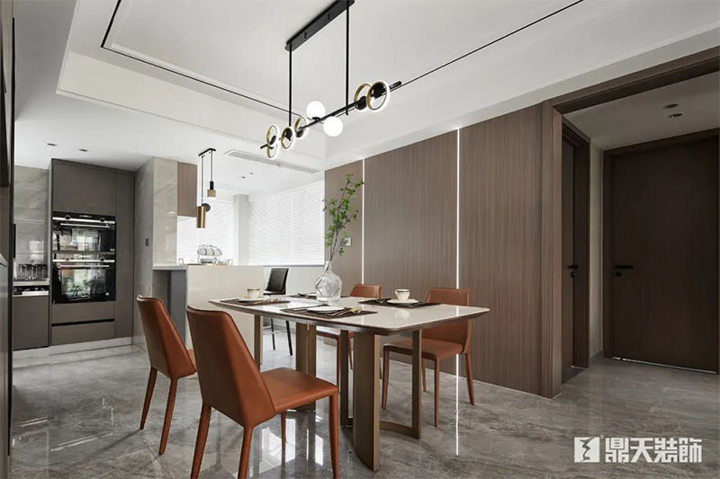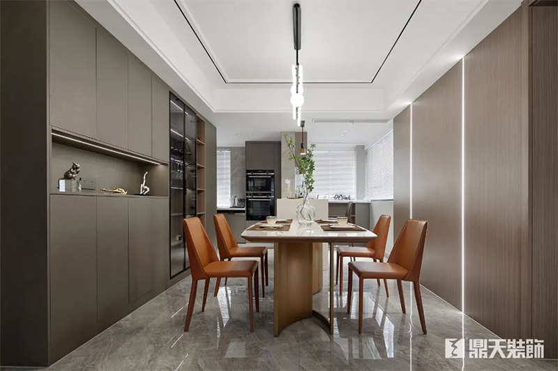 PART02 餐廳 餐廳延續(xù)了客廳的灰色調(diào)的大理石瓷磚,色調(diào)一致,視覺上讓業(yè)主用餐心境更為寧和。餐桌的搭配大大提升了空間的品質(zhì)感與精致度。