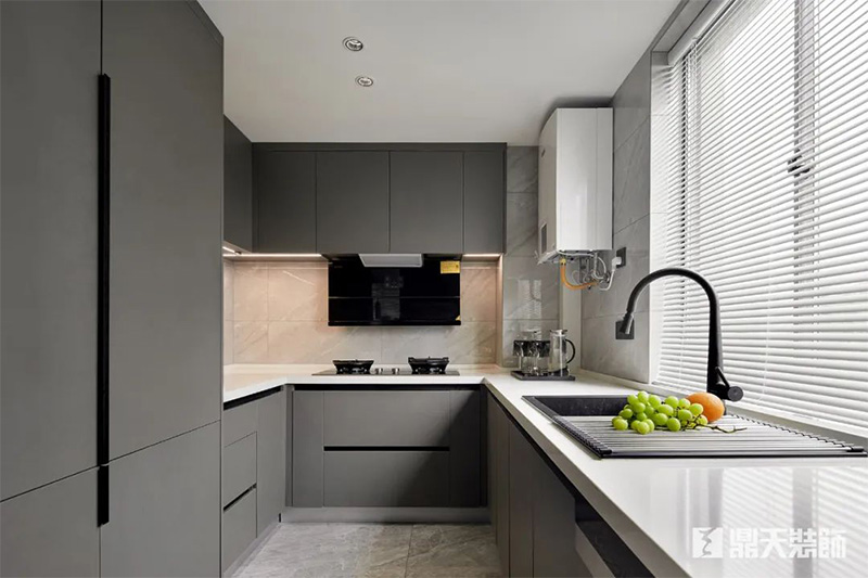 PART03 廚房 灰色櫥柜與石材臺面相呼應(yīng),輕奢而不張揚,更能感受回歸家的溫暖。