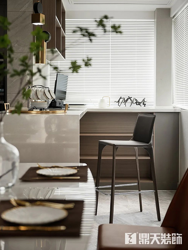 PART04 休閑吧 業(yè)主是一位居家辦公人士,因此工作區(qū)域又是休閑區(qū)域,直角窗戶的設(shè)計加一個吧臺既能當書桌,也能在閑暇之余坐在這喝喝茶、看看風(fēng)景,都是一件很愜意的事。