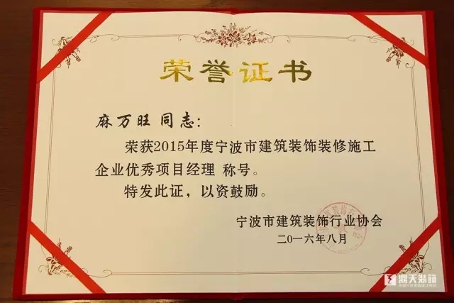 經(jīng)寧波市建筑裝飾行業(yè)協(xié)會(huì)公開、公平、公正的原則,鼎天裝飾再獲殊榮,評(píng)得“2015年度寧波市優(yōu)秀住宅裝飾設(shè)計(jì)獎(jiǎng)”、“2015年度寧波市優(yōu)秀住宅裝飾工程獎(jiǎng)”、“2015年度寧波市建筑裝飾裝修施工企業(yè)優(yōu)秀項(xiàng)目經(jīng)理”等榮譽(yù)獎(jiǎng)牌及榮譽(yù)證書。 鼎天裝飾一直以來秉持“誠實(shí)守信,客戶為先”的信念,已擁有深厚的品牌底蘊(yùn)!鼎天在設(shè)計(jì)、施工、服務(wù)上更是追求極致的精神,讓其在消費(fèi)者心目中的形象與口碑極為良好。這讓鼎天裝飾成為裝飾行業(yè)的佼佼者,同時(shí)也獲得了消費(fèi)者跟同行業(yè)的高度認(rèn)可!
