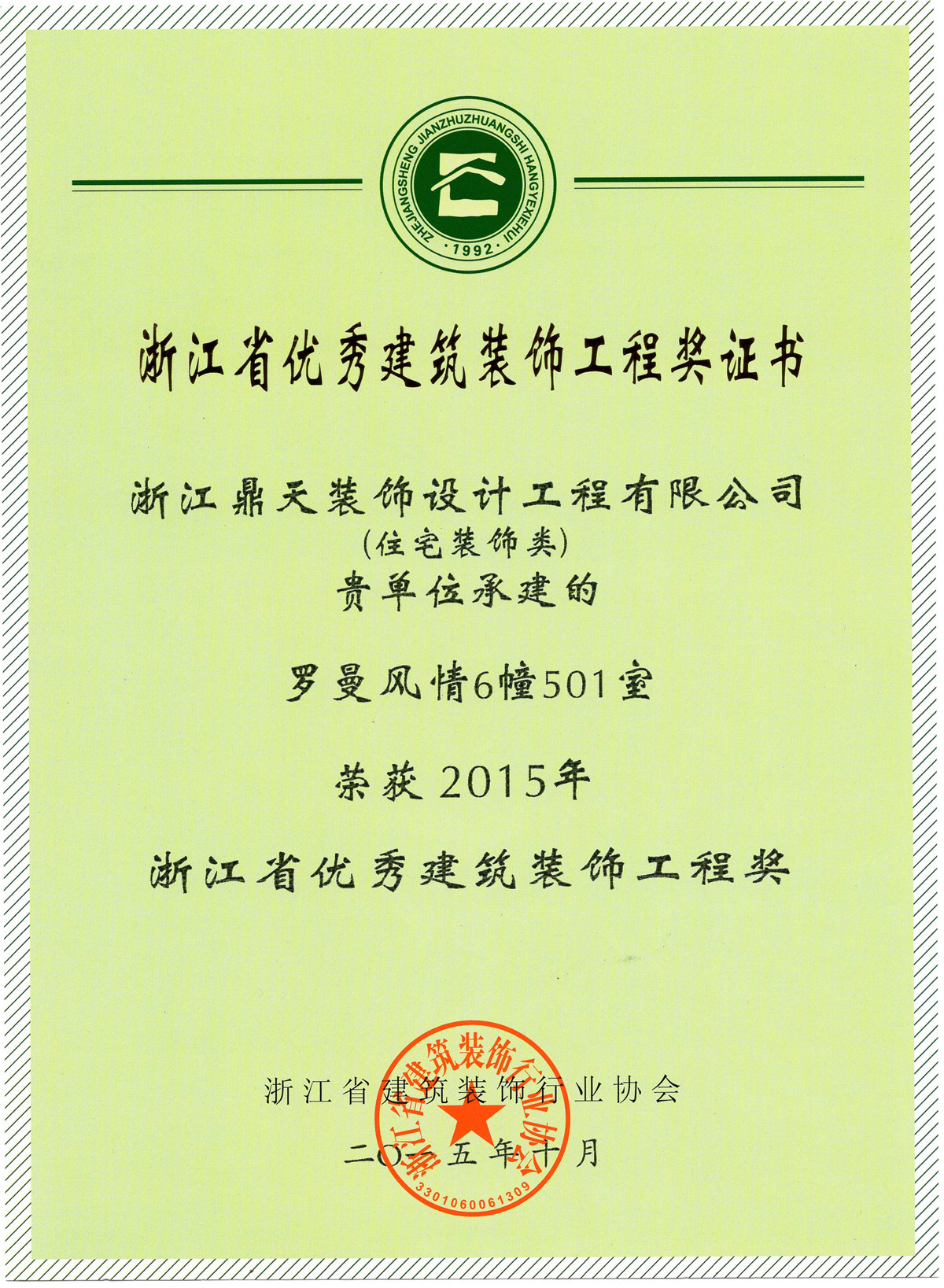 2015年浙江省優(yōu)秀建筑裝飾工程獎(住宅類)經省裝飾協(xié)會資料初查、現(xiàn)場核查、評審委終審,鼎天裝飾“羅曼風情”住宅工程為《2015年浙江省優(yōu)秀建筑裝飾(住宅)工程》項目。 省優(yōu)秀建筑裝飾獎項是浙江省裝飾協(xié)會、舉辦的權威建筑裝飾設計賽事,是彰顯浙江省建筑裝飾行業(yè)整體水平獎項。鼎天裝飾自參賽以來連年榮獲此尊榮,更有省優(yōu)秀建筑設計兩項大獎,極致地證實了鼎天裝飾在浙江省裝飾行業(yè)內、設計與施工專業(yè)上的領先水平。 相關鏈接:鼎天裝飾工程部精英團隊于2015年舉辦的“寧波市裝飾行業(yè)職業(yè)技能大賽”中還勇奪第一名,并將于10月26日代表寧波市裝飾行業(yè)參加浙江省職業(yè)技能競賽,這是繼2012年12月鼎天裝飾設計團隊在“寧波市第三屆科技周室內設計技能大賽”中榮獲第一名之后的又一殊榮!并創(chuàng)下了寧波裝飾行業(yè)設計和施工雙冠軍的佳績!