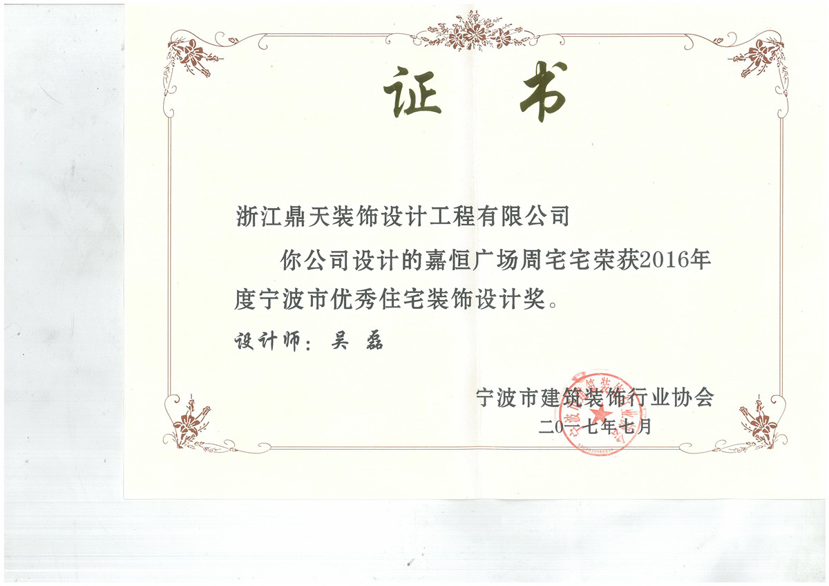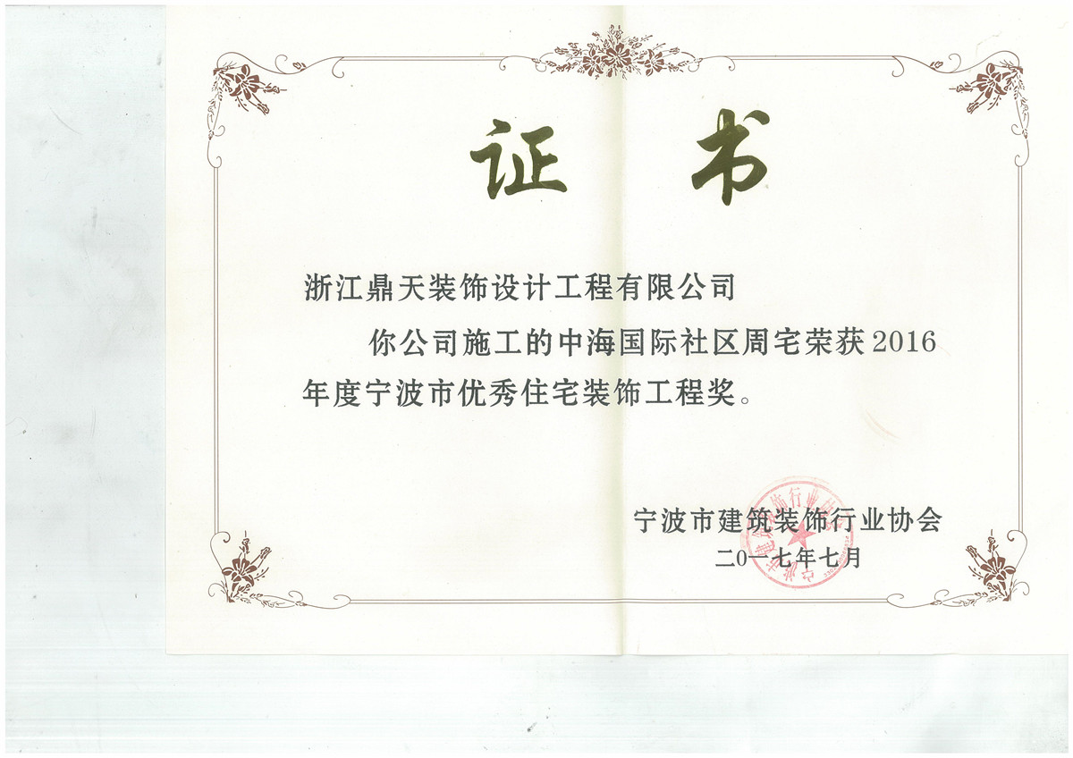 2016年度寧波市優(yōu)秀建筑裝飾工程獎評選活動于日前結(jié)束,經(jīng)過專家組對建筑裝飾企業(yè)申報工程的申報材料審查、現(xiàn)場復(fù)查以及網(wǎng)上公示等工作,共有3家裝飾企業(yè)的4項住宅裝飾工程獲得優(yōu)秀住宅裝飾工程獎,2家裝飾企業(yè)的4項住宅設(shè)計作品獲得優(yōu)秀住宅裝飾設(shè)計獎。鼎天再次斬獲雙獎,繼行業(yè)2004年設(shè)立該獎項以來,鼎天將連年榮獲“省市優(yōu)秀住宅裝飾工程獎”、“優(yōu)秀住宅裝飾設(shè)計獎”。