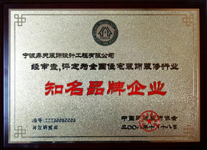 為了促進(jìn)全國裝飾裝修行業(yè)健康,有序,又好又快地可持續(xù)發(fā)展,推進(jìn)行業(yè)的不斷進(jìn)步,表彰先進(jìn),2008改革開放三十周年全國裝飾裝修行業(yè)總結(jié)表彰大會評定:寧波鼎天裝飾設(shè)計工程有限公司 為全國裝飾行業(yè)知名品牌企業(yè).