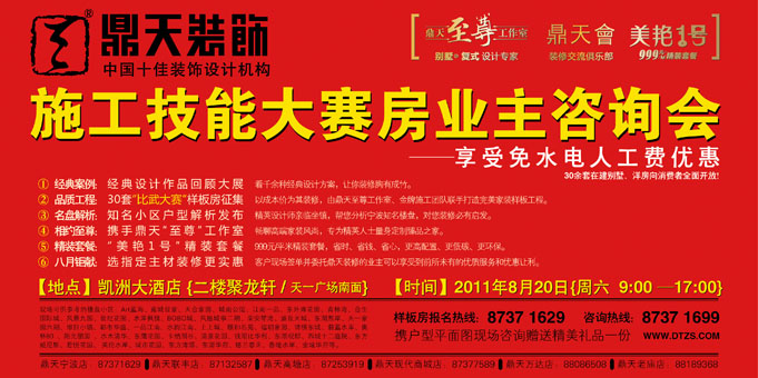 8月20 日(周六)9:00---17:00,鼎天裝飾將在凱洲大酒店(天一廣場(chǎng)南面)二樓聚龍軒舉辦鼎天裝飾施工技能大賽房業(yè)主咨詢會(huì)和優(yōu)秀家裝作品圖片展,到活動(dòng)現(xiàn)場(chǎng)盡享家裝建材大特價(jià)。