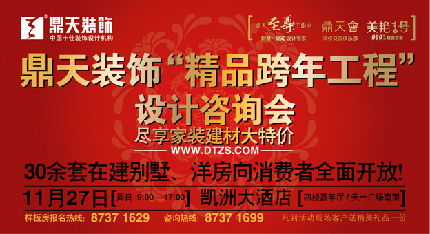 11月27日(周日)9:00---17:00,鼎天裝飾將在凱洲大酒店(天一廣場南面)四樓嘉年廳舉辦鼎天裝飾 “精品跨年工程”設(shè)計咨詢會和優(yōu)秀家裝作品圖片展,到活動現(xiàn)場盡享家裝建材大特價。同時鼎天還將在現(xiàn)場限量征集20套鼎天“精品”樣板房,以成本價為其裝修,由鼎天至尊工作室、金牌施工團隊聯(lián)手打造完美家裝樣板工程。在現(xiàn)場簽單并委托鼎天裝修的業(yè)主可以享受到前所未有的優(yōu)質(zhì)服務(wù)和優(yōu)惠讓利。凡到活動現(xiàn)場客戶送精美禮品一份