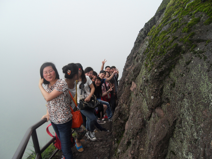 江郎山聚巖洞、云、瀑于一山,集奇、險、陡、峻于三石。停下腳步,抬頭仰望,高高的石墻,長長的石階,穿行其間,寒氣逼人,直透脊梁。雖然如此驚險、艱難,但在我們團隊相互的鼓勵下,我們終于爬到了山頂,看著四周的美景,感覺到了“會當(dāng)臨絕頂,一覽眾山小”的神氣場面!