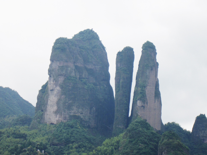 我們沿著彎曲、陡峭的山路,直接朝著山頂攀登,山頭的薄霧還未消散,這是昨夜被雨水洗禮過的緣故。放眼望去,巍峨矗立的江郎山在即將散去的薄霧里若隱若現(xiàn),蔚為壯觀,一路上我們盡情的吮吸著雨水所帶給我們的好空氣。