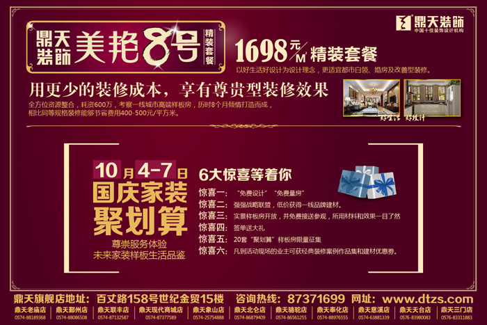 所有到場參加活動的客戶都將得到鼎天公司提供的國慶精美禮品一份。6大驚喜,讓您暢享家裝聚劃算!