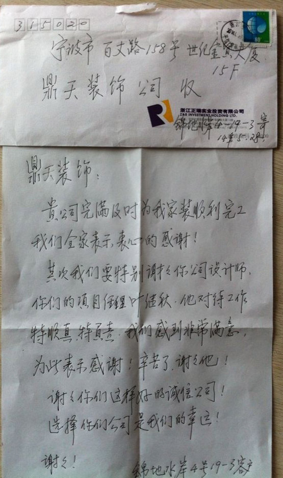錦地水岸4號(hào)19-3客戶至鼎天的感謝信