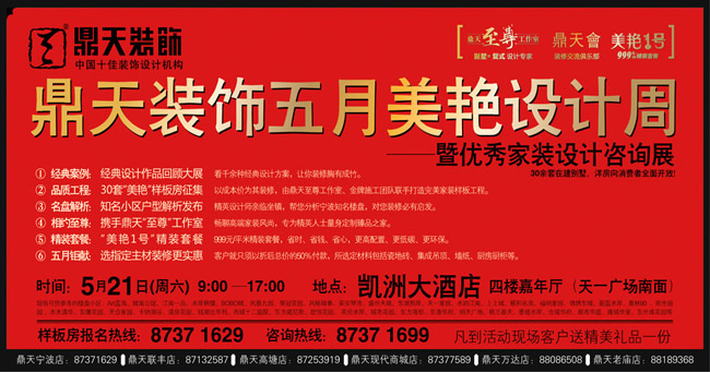 5月 21 日(周六)9:00---17:00,鼎天裝飾將在凱洲大酒店(天一廣場南面)四樓嘉年廳舉辦鼎天裝飾2011美艷設計周和優(yōu)秀家裝設計咨詢展活動。消費者到活動現(xiàn)場可盡享家裝建材大特價。同時鼎天還將在現(xiàn)場限量征集30套鼎天“美艷”樣板房,以成本價為其裝修,由鼎天至尊工作室、金牌施工團隊聯(lián)手打造完美家裝樣板工程。而在現(xiàn)場簽單并委托鼎天裝修的業(yè)主可以享受到前所未有的優(yōu)質服務和優(yōu)惠讓利。凡到活動現(xiàn)場客戶送精美禮品一份。